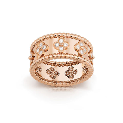 ペルレ クローバー リング、ローズ ゴールド、ラウンドカット ダイヤモンド、ミディアムモデル。ダイヤモンド DEF IF~VVS。