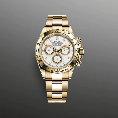 18 ct イエローゴールドのオイスター パーペチュアル コスモグラフ デイトナは、ホワイトダイアルとオイスターブレスレットを備え、18 ct イエローゴールドタキメーターベゼルが特徴的である。